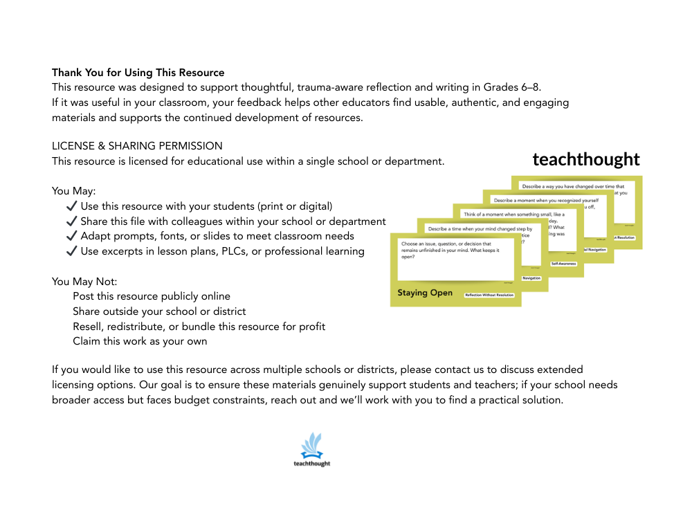 This resource is designed with trauma-aware teaching in mind. While some prompts may be appropriate for small-group sharing, others—and some students—may benefit from keeping their writing private. Prompts are intentionally written to avoid requiring disclosure, but teachers are encouraged to use professional judgment when deciding if, how, or whether sharing should occur.